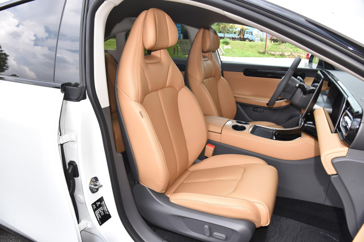 在舒适模式下,过减速带的时候,悬挂动作很干脆,“噗呲” 两下就过去了,基本没有余震,坐在车里感觉很平稳,特别适合带老人小孩出行;切换到运动模式后,在 60km/h 绕桩的时候,侧倾明显比同级别的家用轿车要小;不过和特斯拉 Model 3 比起来,悬挂的整体感、紧绷感还是可以优化一下的。